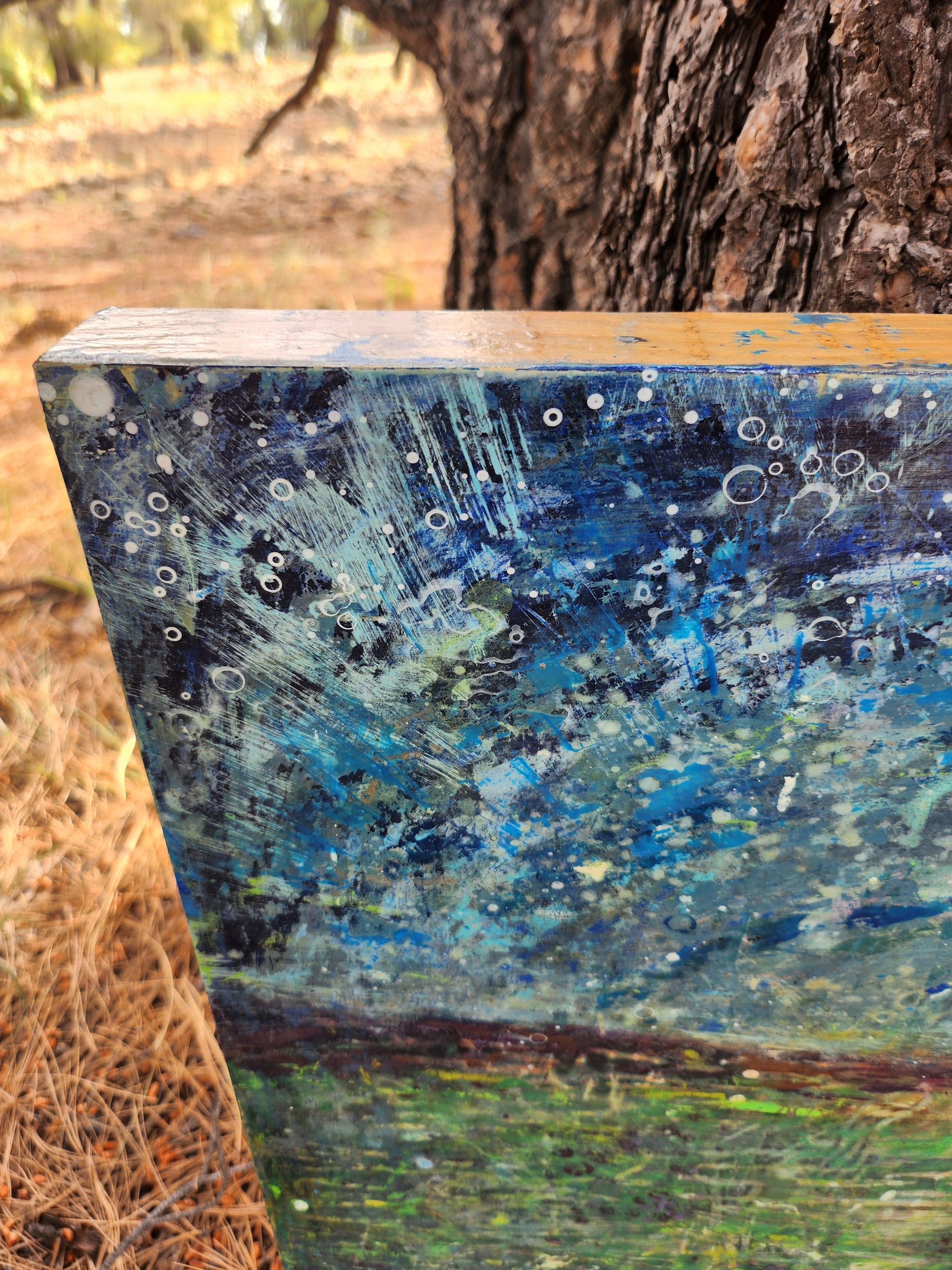 These artworks are the visual retelling of this journey. A reflection of what I have searched for and found while living full-time on public lands. They're created using a lengthy process of natural weathering and layer upon layer of oil pastel, ink, paint and various print techniques.This one shows the full moon rising over the Arizona Verde Valley, as viewed from my campsite in Cottonwood .